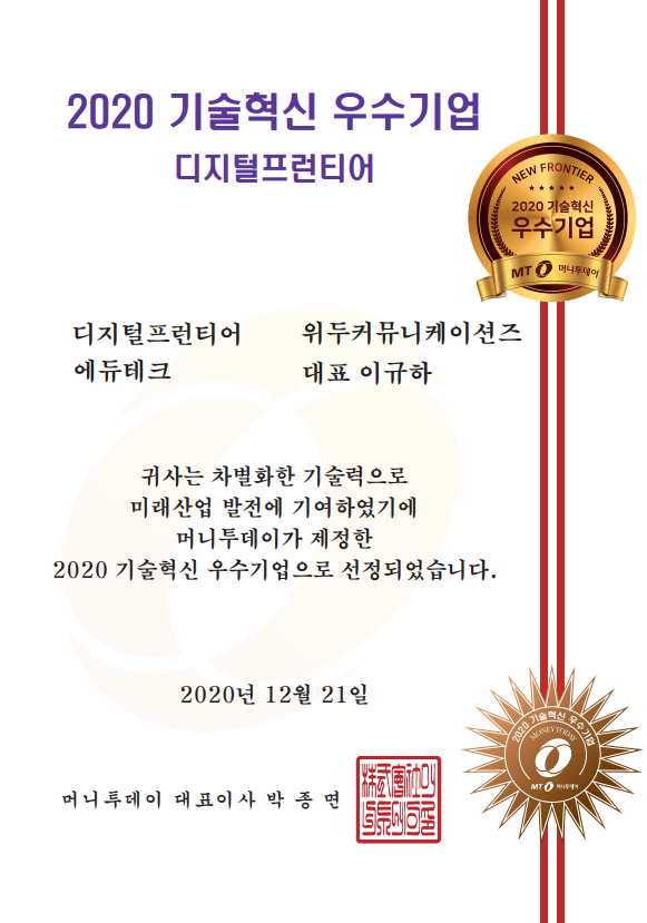 2020 기술혁신 우수기업 페이지 정보 작성자 WeDu 댓글 0건 조회 5,646회 작성일 21-12-31 12:58 본문 2020-12-21 2020 기술혁신 우수기업 디지털프런티어 에듀테크 머니투데이 대표이사 List Previous2020 소년한국 우수 어린이 도서 선정 21.12.31 Next2020 서울산업진흥원 2020 DMC어워드 21.12.31