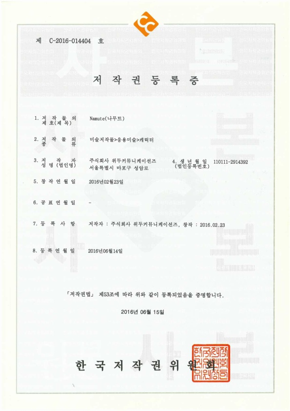 [한국/저작권] 나무트 페이지 정보 작성자 WeDu 댓글 0건 조회 5,738회 작성일 19-05-30 19:08 본문 2016-06-14 저작권 C-2016-014404 나무트 / 미술저작물>응용미술>캐릭터 List Previous[한국/저작권] 리안 19.05.30 Next[한국/저작권] 길리 19.05.30
