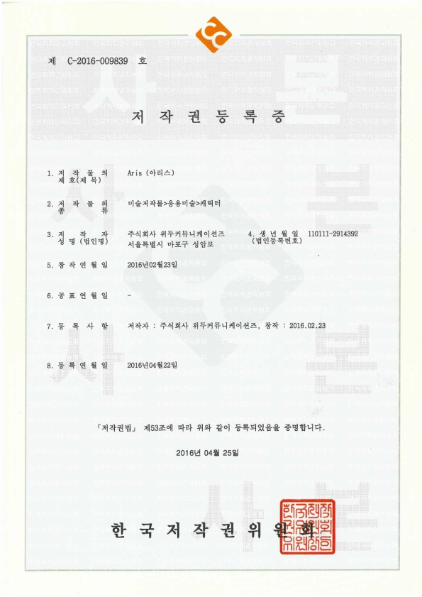 [한국/저작권] 아리스 페이지 정보 작성자 WeDu 댓글 0건 조회 5,822회 작성일 19-05-30 19:09 본문 2016-04-22 저작권 C-2016-009839 아리스 / 미술저작물>응용미술>캐릭터 List Previous[한국/저작권] 필립 19.05.30 Next[한국/저작권] 리안 19.05.30