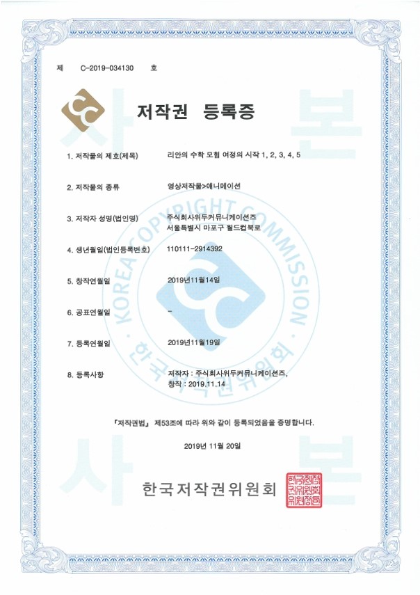[한국/저작권] 리안의 수학 모험 여정의 시작 1,2,3,4,5 페이지 정보 작성자 WeDu 댓글 0건 조회 5,461회 작성일 21-12-31 12:36 본문 2019-11-20 저작권 C-2019-034130 영상저작물>애니메이션 List Previous[한국/저작권] OLL KIDS/MATH 21.12.31 Next[한국/저작권] 리안의 수학 모험 애니메이션 OST 19.11.25