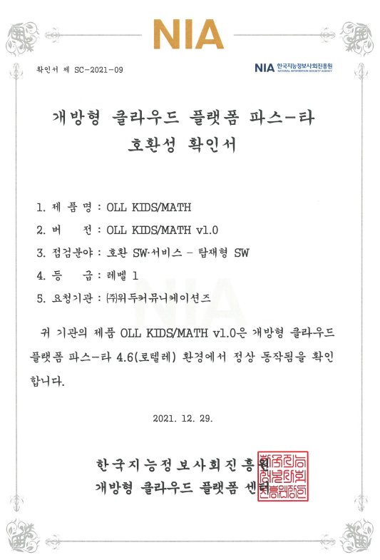 [한국/확인서] OLL KIDS/MATH 파스-타 호환성 확인서 페이지 정보 작성자 WeDu 댓글 0건 조회 9,307회 작성일 21-12-31 12:48 본문 2021-12-29 확인서 제 SC-2021-09 점검분야 : 호환 SW서비스 - 탑재형 SW List Next[한국/인증서] OLL KIDS/MATH 클라우드 서비스 확인서 21.12.31